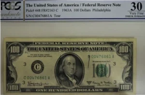Billet de 100 dollars C00476861A – PhiladelphieSérie 1963Amarques au crayon à papier à l’avers.Sous étui PCGS.