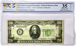 Billet de 20 dollars des Etats-Unis type « Federal Reserve Note »1934 Richmondnuméro de série : E08305628AGrade PCGS : Choice VF35