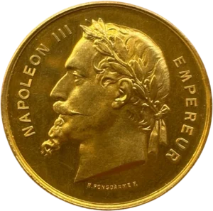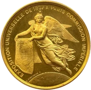 Les médailles sont présentées dans leur coffret d’origine rouge avec feutrine et soie bleue. Elles ont été décernées pour services rendus à l’occasion de l’Exposition Universelle de 1867 et pour les membres de la Commission impériale (60 membres), constituée pour l’organisation de l’Exposition.Attribué à Monsieur Bidermann.
