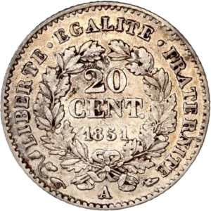 Lot de deux monnaies de 20 centimes type CérèsMillésime 1850 et 1851.