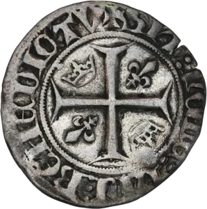 Lot de deux Blancs royaux comprenant :- Un Blanc au soleil de Louis XI le Prudent atelier de Saint-Lô (Dy. 553).- Un Blanc Guénar sans point d’atelier (Paris) (Dy. 377).