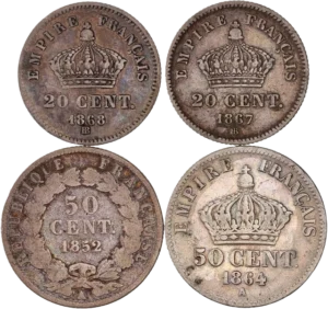 Lot de 4 monnaies divisionnaires Napoléon III2x 20 cts 1867BB et 1868 BB2x 50cts 1852 et 1864 A