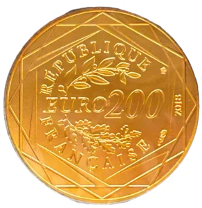 La valeur faciale "200 EURO" entre deux branches de laurier et de chêne, entourées de l'inscription "RÉPUBLIQUE FRANÇAISE" de trois hexagones et du millésime