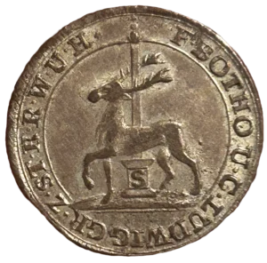 Un cerf à gauche au dessus d'un socle surmonté d'une colonne avec la lettre S à la base de la colonne, dans un cercle entouré de la légende.