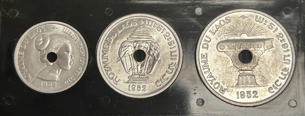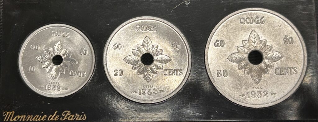 Royaume du Laos :Série d’essais 1952 dans le coffret Monnaie de Paris.10 Cents, 1,3 g en aluminium, diamètre de 23 mm.20 Cents, 2,2 g en aluminium, diamètre de 27 mm.Rare série frappées à 1200 exemplaires.