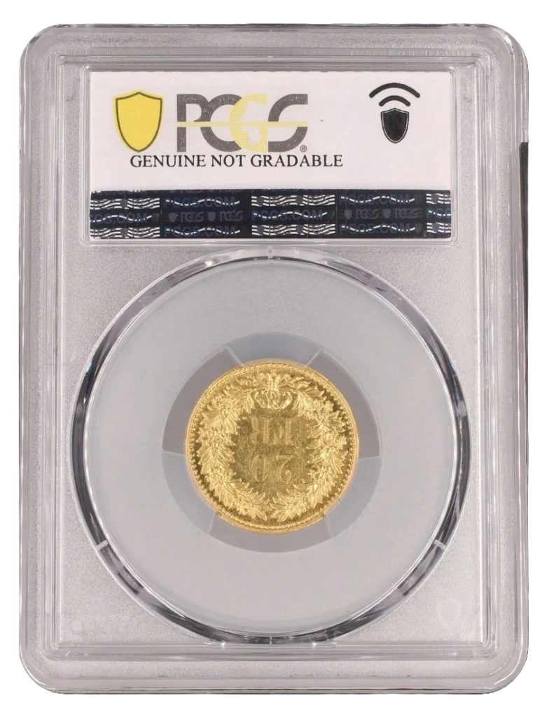 Graveurs : Voigt et Barre.Note : Très rare essai Suisse en or ! Le nombre d’exemplaires frappés n’est pas connu avec précision. Divo cite le chiffre de Hofer, soit 25 à 30 exemplaires.Nettoyée, anciennement monté en bijoux mais néanmoins superbe exemplaire !PCGS SP
