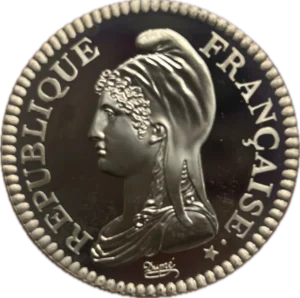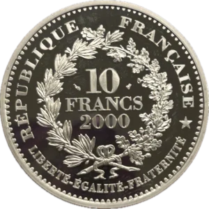 10 Francs 2000 dans une couronne de lauriers entourée de la devise de la France et République française.