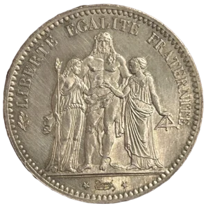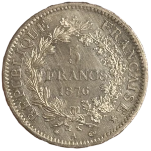 L'inscription "5 francs 1876" entouré d'une couronne de laurier et de chêne.