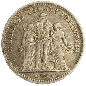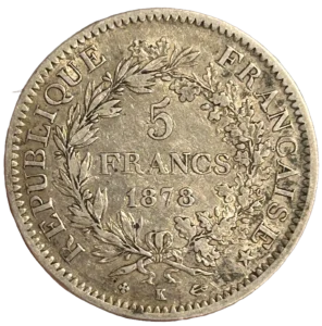 L'inscription "5 francs 1878" entouré d'une couronne de laurier et de chêne.