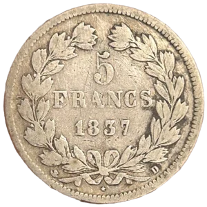 L'inscription "5 francs 1837" entouré d'une couronne de laurier et de chêne.