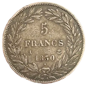 L'inscription "5 francs 1830" entouré d'une couronne de laurier et de chêne.