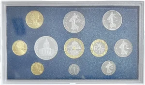 Coffret belle épreuve de la Monnaie de Paris, contenant les monnaies habituelles ainsi qu’une la monnaie de 1 centime épi.Coffret émis à 15 000 exemplaires.Note : Numéro de certificat 1078.Bon état général.