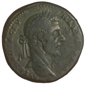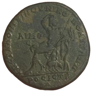 Personification d'Hémus assis sur un rocher, tenant un longue lance transversale. A ses cotés, ce qui semble être un thyrse et à ses pieds, un ours passant à droite.