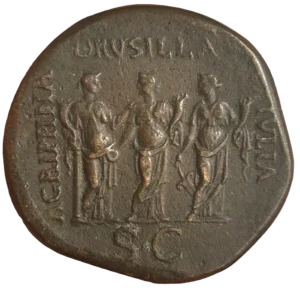 Les trois soeurs de Caligula debout de face : Agrippine, Drusilla et Julia.