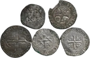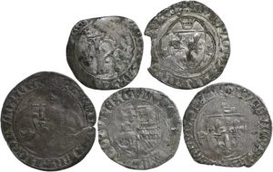 Lot de cinq monnaies royales époque XIVème siècle à identifier.