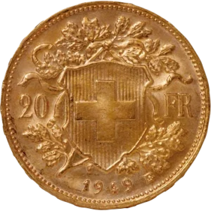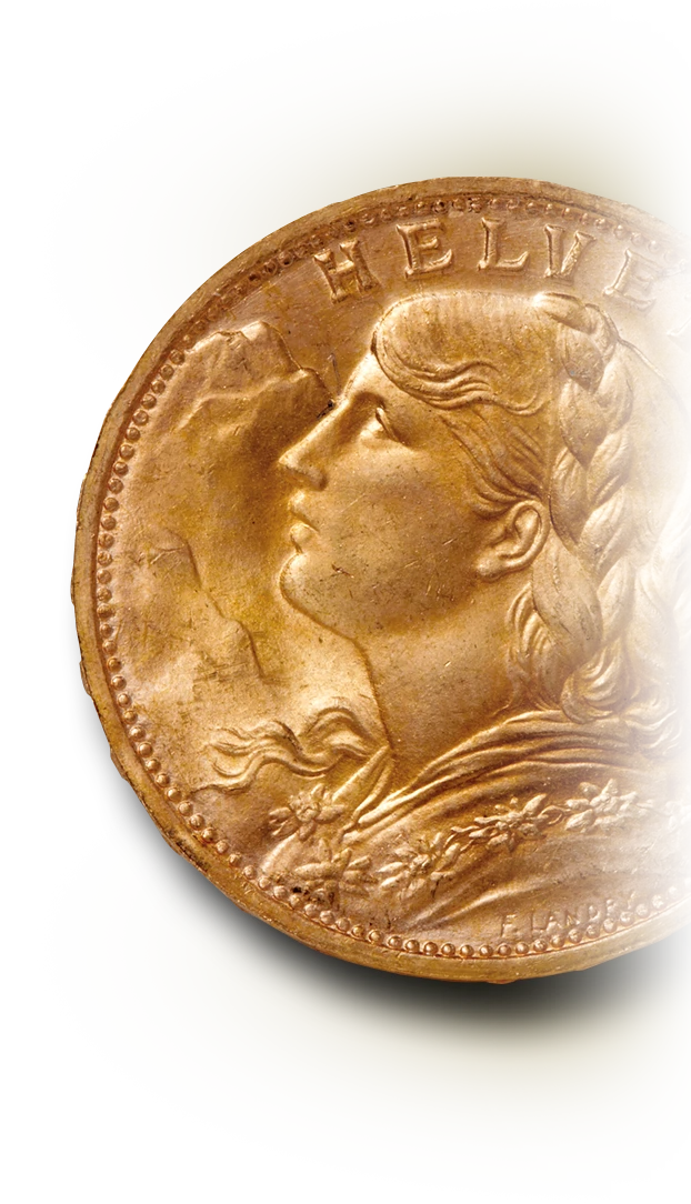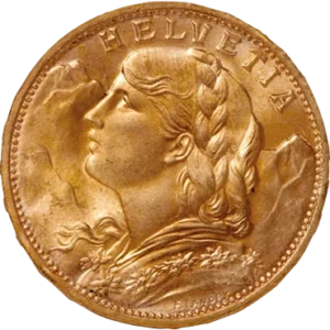 C’est en 1848 que naĂ®t la ConfĂ©dĂ©ration suisse, avec l’instauration de l’État fĂ©dĂ©ral. Le franc suisse devient officiellement alors la monnaie unique le 7 mai 1850. Il faudra attendre une injonction de la France en 1883 pour que la Suisse commence Ă frapper des pièces en or. Au cours de son histoire, la Suisse produira deux sĂ©ries diffĂ©rentes de pièces d’or de 20 francs : La première version, dite Helvetia, n’a Ă©tĂ© frappĂ©e qu’entre 1883 et 1896. La seconde, la plus connue et la plus frappĂ©e, celle dite Vreneli, a Ă©tĂ© frappĂ©e de 1897 Ă 1949.